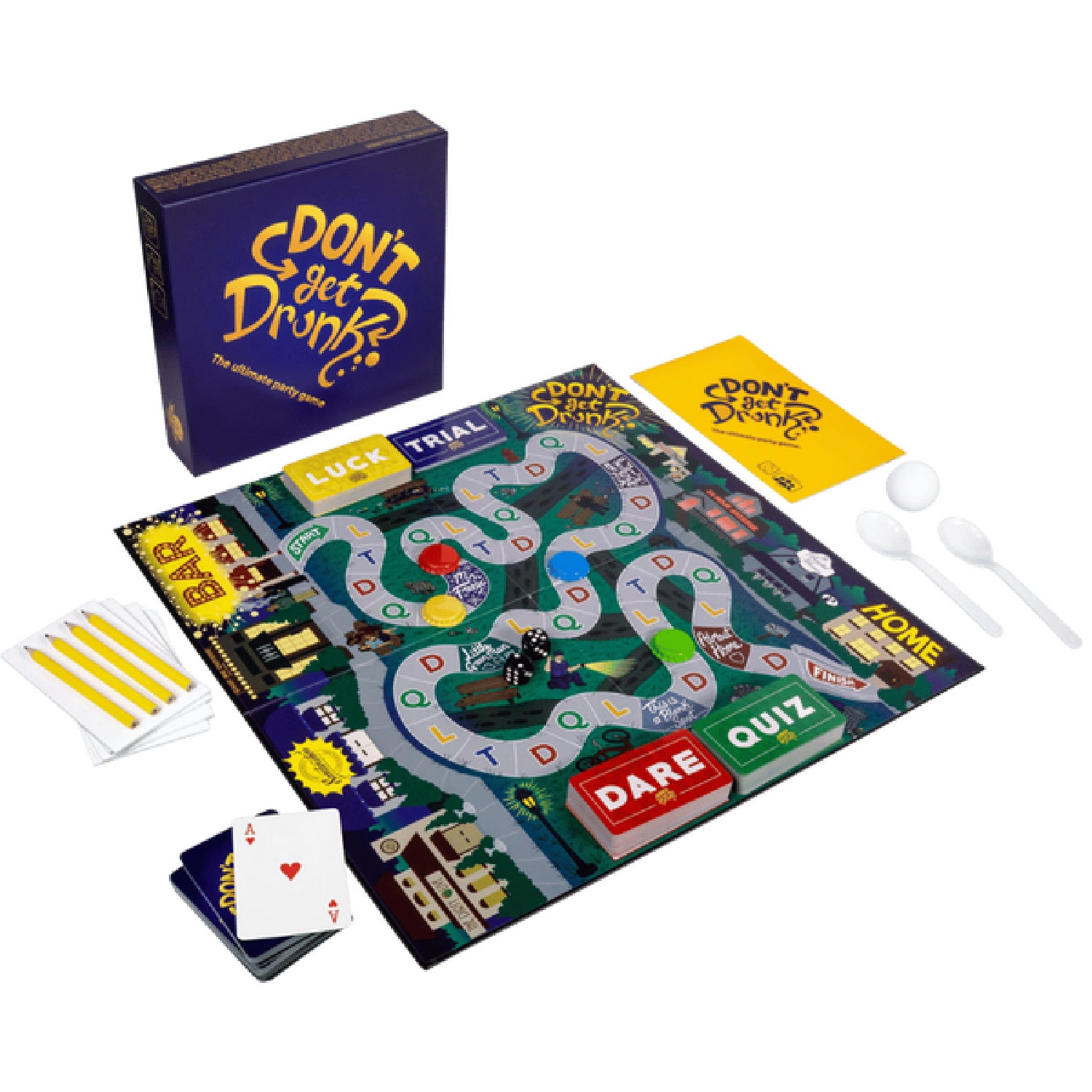 How to win and play: Its easy, you just have to be the first person or team to make it from the bar spot to the home spot. Roll the dice and move that amount of spaces, pick the corresponding card and do what it says, or don't, but beware there will be punishments! You only have to refer to the instruction manual for trial cards as they are pulled, this makes for less reading and more fun! Don't be afraid to sabotage your opponents to get ahead in the game!