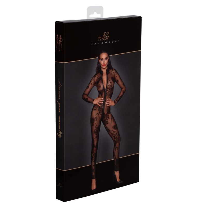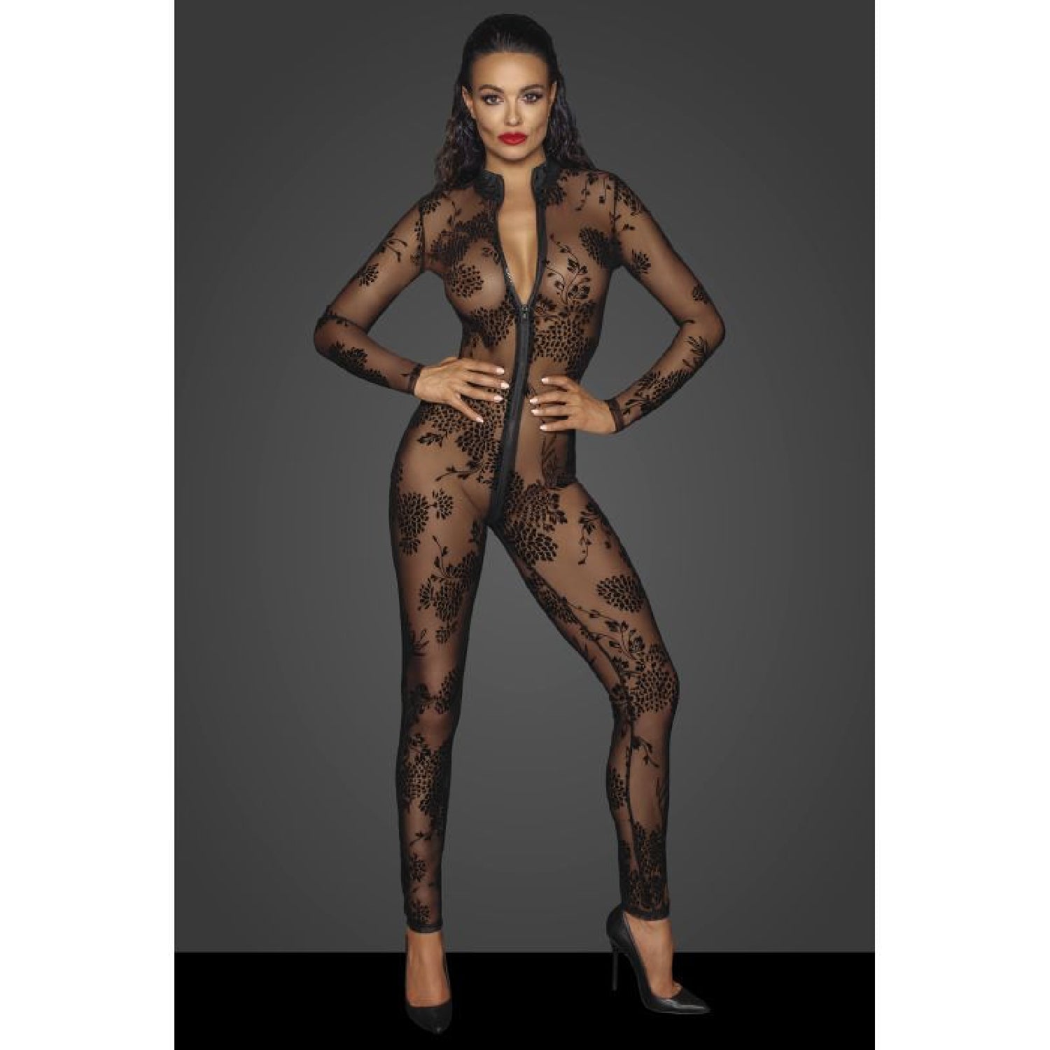 This sexy long tulle overall is adorned with flock embroidery and long 3 way zipper that goes from the collar all the way down to the crotch.