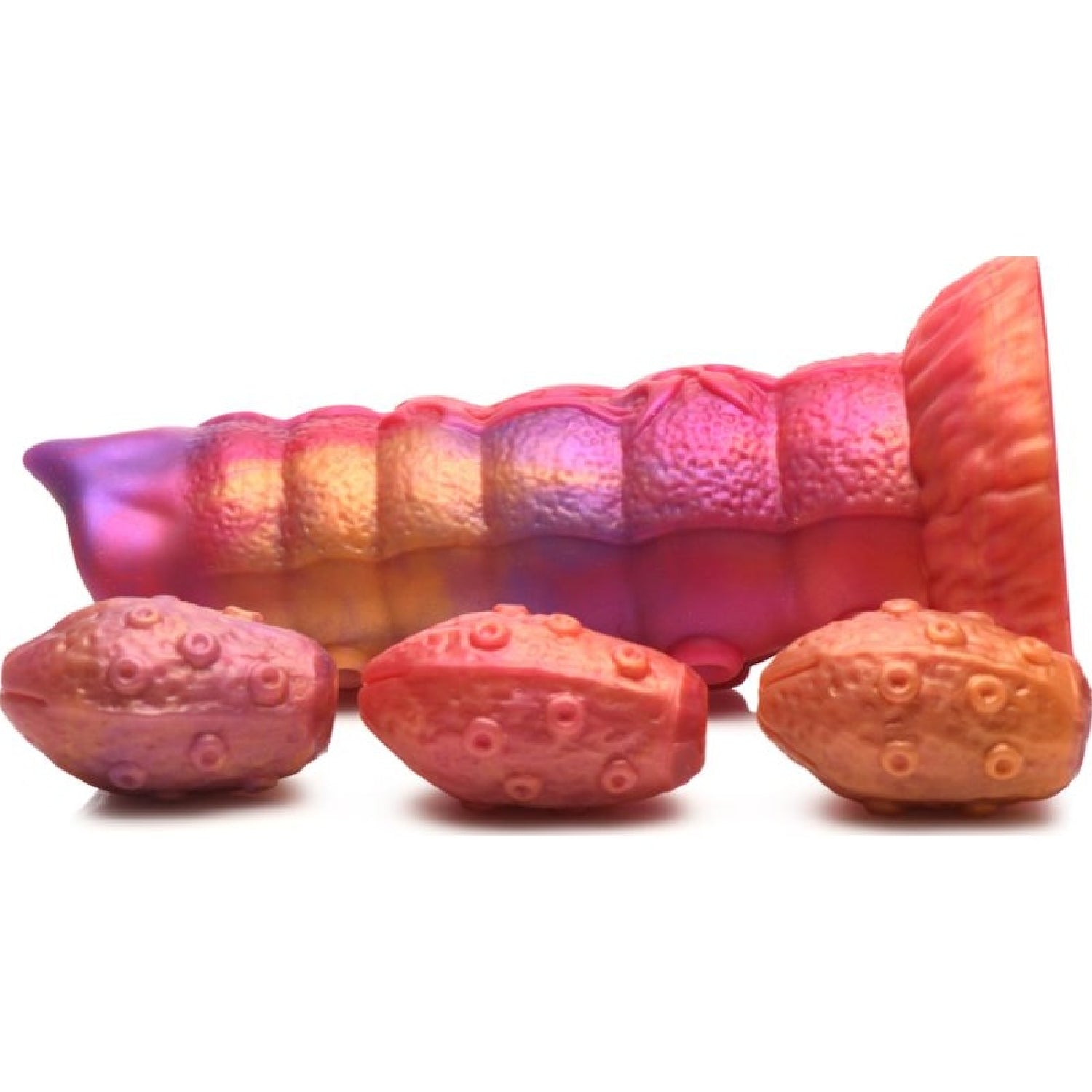 This unique ovipositor comes in a sunset color combination of yellow, orange and pink! This Nymphoid humanoid tentacle monster can walk on land and has an extra appendage to lay their eggs inside you! The thick shaft has segmented ribs and an open head for eggs to come through. Along one side is a mysterious, alien symbol. The long, soft, and flexible shaft has a hollow center that is wide enough for the soft, silicone eggs to slip through and impregnate you with! The shaft itself is blue, pink, and pearly white and it fits up to 3 yellow-orange eggs inside of it. The wide, flanged base makes it harness-compatible. Made out of premium, phthalate-free silicone, it has a firm core and soft, silky surface. Explore every sci-fi, fantasy, roleplay, or cosplay scene you want with this epic adult toy! Use only water-based lubricants for best results. After play is over, wash the dildo with warm water and soap and use a toy cleaner to spray clean. Wipe dry and store in a cool, dark place out of direct sunlight