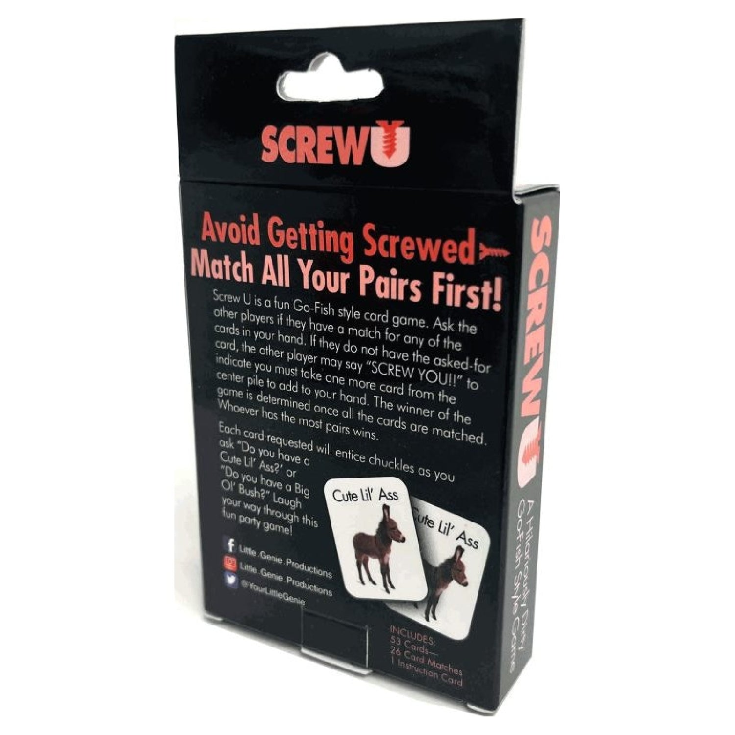 Do you have a “Wet Pussy†or a “Big Black Cock� Screw you is a fun and suggestive Go-Fish-style card game. Ask the other players if they have a match for any cards in your hand. If they do not have the card, the other player says, “SCREW YOU,†The player must take one more card from the center pile to add to their hand. The winner of the game is determined once all the cards are matched. Whoever has the most pairs wins. Screw U is a hilarious adult party card game that will have your guests roaring in delight!