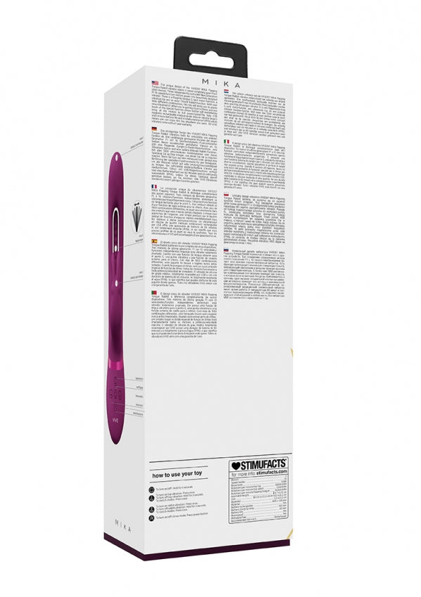 The unique design of the VIVE057 MIKA Flapping Tongue Rabbit vibrator makes it stand completely apart from other devices. Three independently controlled New Generation F1 10-speed/function motors power this beautifully designed vibrator. There is a flapping tongue G-spot motor function, a vibration tip and an outer clitoral Rabbit function. With over 1000 different combinations this toy will bring you to places never dreamed of. When you're getting close to climax, just one touch of the special function climax button will immediately bring all the motors to full power/speed.The fully USB magnetic rechargeable medical-grade silicone vibrator boasts a 60-minute battery life and is totally waterproof (IPX6) which means you can enjoy this toy anywhere you want. All VIVE vibrators come with a 1-year warranty.